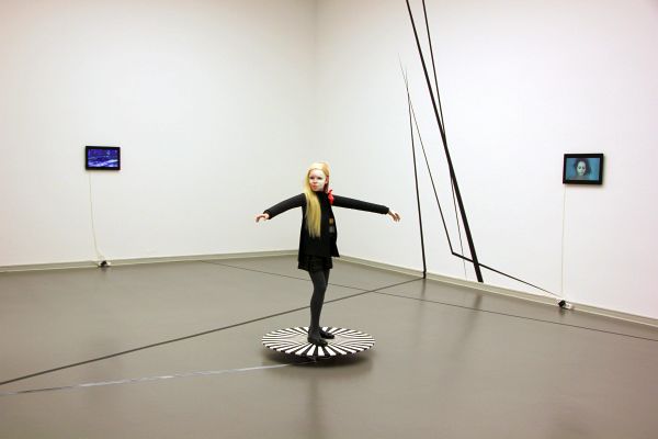Maike Freess, die ihren Schwerpunkt auf Papierarbeiten, insbesondere ihre detailreichen und düsteren Porträts und hier auf Augen und Hände legt, ist eine vielfach begabte Künstlerin. Der Gang durch die fünf mit „Cuts“, also kunstvoll angelegten optischen Schnitten, konzeptionell miteinander verbundenen Räume offenbart ihren tiefen, hintergründigen Humor, der allerdings bisweilen, horribile dictu, in leises Grauen übergeht. So begegnen wir im ersten Raum neben einer dreidimensionalen hölzernen Installation, welche die auf den Boden applizierten schwarzen Linien – besagte Cuts – übernimmt („Energie durch Gravitation“), lebensgroßen detailreichen teils kryptischen Porträtzeichnungen und an der Stirnwand der ebenfalls lebensgroßen Farbfotografie „Insomnia 2 – Geteert / Gefedert“. Wie bei den meisten ihrer Fotoarbeiten ist Maike Freess selbst das Modell dieser scheinbar stummen Leidenssituation, aus der jedoch aus weit aufgerissenen Augen der Schrei der mißhandelten Seele den Betrachter unaufhörlich verfolgt.