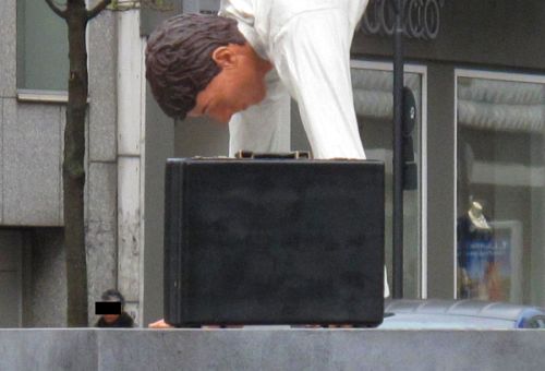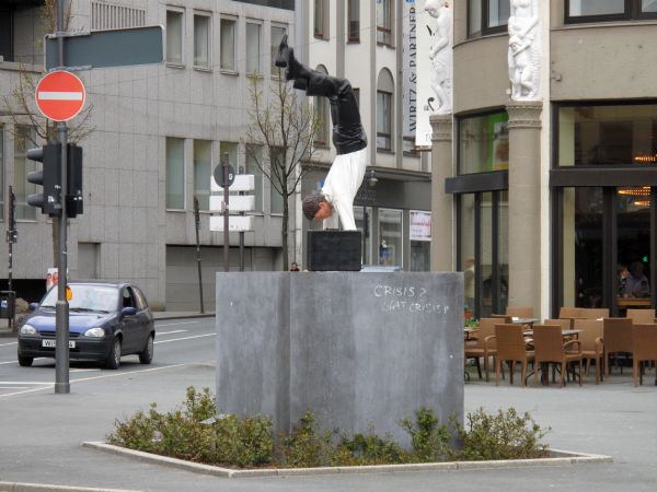 Die Bronzeskulptur des einen Handstand machenden Bankers „Ein neuer erfolgreicher Tag“ (2008) von Guillaume Bijl an der Herzogstraße / Ecke Kasinostraße in Wuppertal, die zur Sammlung des Von der Heydt-Museums Wuppertal gehört, wurde erneut mutwillig beschädigt.
