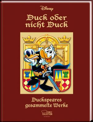 Seit dem Wochenende (5./6. März) sind „Duck oder nicht Duck - Duckspeares gesammelte Werke“ in solide gebundener Form im Handel erhältlich. Den Umschlag ziert ein schwarz gewandeter Donald in der Rolle Hamlets im Augenblick seines berühmten Monologs, der auch Donald wie auf den Bürzel geschneidert ist: