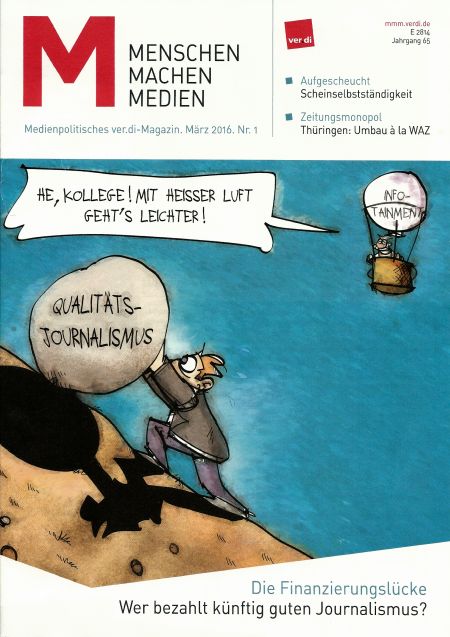 Warum zeigen wir Ihnen heute und hier das Titelblatt der März-Ausgabe von „Menschen machen Medien“, der ver.di-Publikation mit der aussagekräftigen Zeichnung von Kostas Koufogiorgos? Weil man das Problem kaum besser beschreiben könnte. Leser von Tageszeitungen klagen schon lange über den spürbaren Qualitätsverfall vor allem der Lokalberichterstattung und der lokalen Kulturberichterstattung. Aber was will man z.B. von freien Journalisten erwarten, die für den Hungerlohn von 30,- € brutto für ihr Blatt zu einem Termin fahren, ihn für bis zu mehreren Stunden wahrnehmen, wieder heimfahren, sich an den PC setzen und einen Text dazu verfassen? Durchschnittlich wenden sie vier Stunden dafür auf, oft auch mehr. Das sind dann maximal 7,50 € brutto pro Stunde, die natürlich noch versteuert werden müssen. Wenn ein freier Journalist Glück hat, kommt er also auf einen Stundenlohn von 6,- € netto. Dann greift oft noch eine uninformierte Redakteurin vom „Desk“ in den Text ein, um ihn zu verschlimmbessern. Das Ergebnis liegt dann auf Ihrem Frühstückstisch.