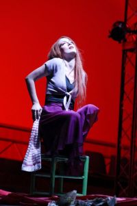 Der Rest ist Ritual, ist traditionelle Vollstreckung barbarisch eherner Dorfgesetze. Das weiß auch Turridu, und so wirft er in einem grandios inszenierten Finale auf offener Bühne sein Messer zur Seite und bietet Alfio die Kehle an. Der Mord ist nur die stringente logische Vollstreckung der Todesstrafe, die solcherlei Vergehen nun einmal nach sich zieht. Die untreue Lola wird standesgemäß als nächste folgen, das ist hier schon klar. Ein Finale, das unter die Haut zeitlich mitdenkender Menschen geht. Fünf Sterne - ohne Einschränkung! Neben einer exzellenten Lichtregie beeindruckte auch und vor allem der bestechende Bühnenraum, den Harald Thor geradezu kongenial für die Mielitzsche Handlungs-Dramaturgie entworfen hat. Die mit Abstand beste und dichteste Inszenierung, die ich von der Regisseurin Christine Mielitz bisher gesehen habe. Für diese ungeheuer unter die Haut gehende Arbeit und die fantastische Ensembleleistung: 5 Sterne ohne Einschränkung! Beim BAJAZZO ist, schon der Musik entsprechend, grellbunte Farbigkeit angesagt. Der Prolog spielt vor dem großen geschlossenen Theatervorhang. Danach zeigt uns die Regie das heftige und
