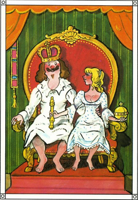 Die kluge Bauerntochter „Lieber Herr König, Ihr habt mir befohlen, ich sollte das Liebste und Beste aus dem Schloß mitnehmen. Nun habe ich nichts Besseres und Lieberes als dich, da hab ich dich mitgenommen.“ Thomas Schleusing pinx. - © Brigitte Schleusing
