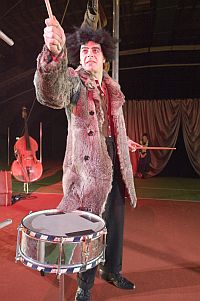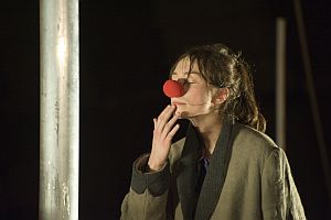 Artisten unter der Zirkuskuppel... Die Bühne hatte Christoph Rasche in der seit einigen Jahren als zusätzliche Spielstätte dienenden alten Tennishalle am Stadtrand von Moers in einen recht heruntergekommenen kleinen Zirkus verwandelt mit Vorhang, kleinem Zuschauerrund und hochaufragenden Stangen. Dazwischen lag "La Strada". Polternd Holger Stolz als zottelhaariger Zampano, der erst dann richtig seine Armseligkeit präsentierte, wenn ihm die Perücke vom Kopf rutschte und er so gar nicht mehr wüst und brutal aussah. Einer, der sich in seiner Armut eingerichtet zu haben scheint und der doch immer wieder dann, wenn er von anderen darauf angemacht wird, darüber in Zorn und Hilflosigkeit gerät.  Nah am Film-Original Aber fröhlich-circensisch geht es nur vordergründig zu in dem rund 80 Minuten dauernden Bühnenstück, das die Moerser Theatermacher im Rahmen des diesjährigen Schwerpunkts "Armut" auf den Spielplan gehoben haben. Trotz einiger bunter Farben und Kostüm-Tupfer ist die Inszenierung nicht grell überzeichnet sondern bleibt nahe am Oscar-premierten Fellini-Film, der als schwarz-weiß-Streifen in seiner Tristesse bis heute zu überzeugen weiß. Ganz am Ende, als Zampano vom Tod der kleinen Gelsomina erfährt, die er nach dem Mord verlassen hatte, beweist er in seiner Verzweiflung Größe. Er brüllt seine Armut und seine Einsamkeit heraus und zeigt für alle sichtbar, daß er daran leidet.