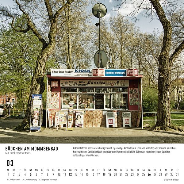 Der Fotograf Stefan Matthiessen, der sich auf die Kioske von Köln spezialisiert hat, gehört zu den Künstlern, die Anteil an dieser Bewahrung und Wiederentdeckung eines wichtigen Stücks Alltagskultur unserer Heimat haben. Mit seinem Büdchenkalender 2017 können sie mit ihm auf Büdchentour in Köln gehen.