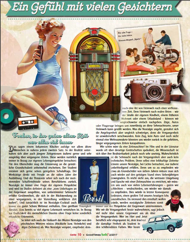 Inhalt: 10 Nostalgie: Ein Gefühl mit vielen Gesichtern - S. 12 Karl-May-Comics: Winnetou, die Babyboomer und ein neues Medium - S. 16 Marilyn Monroe: Blondine mit Anspruch sucht Rollen - S. 20 Das Jahr 1967: Krieg in Vietnam, ein Sergeant namens: Pepper & Fernsehen in Farbe - S. 24 Die Welt der Superhelden: Von A-Z - S. 30 Schokoriegel und ihre Werbung: Einfach aufreißen und genießen! - S. 34 VEB Defa: Kultstreifen made in GDR - S. 36 CD-Player Sony CDP-X 777 ES: Meisterwerk der Technik! - S. 38 Werbeikonen - S. Serie (Teil 4): Die Odyssee des Camel-Manns - S. 40 Unvergessene TV-Charaktere - S. Serie (Teil 5): Percy Stuart - S. 42 Endzeitfilme: Die Verfalldaten der Apokalypsen - S. 44 Klaus Fischer: Das Tor des Jahrhunderts - S. 46 Die Biene Maya: Das ewige Summen für Jung und Alt - S. 55 Die Kuschelbären: Wie das Plüsch im Walde - S. 56 Alf: Außerirdisch humorvoll - S. 58 Edel-Seifenopern der 80er Jahre - S. Serie (Teil 3): Falcon Crest - S. 62 Manfred Krug: Mensch (,) Manne! - S. 64 Kultbücher: Geschätzt, geliebt, gelobt - S. 66 Kino-Bösewichte - S. Serie (Teil 4): Christopher Lee - S. 68 Peeping Tom (Augen der Angst): Wie ein Skandalfilm beinahe: Karlheinz Böhms Karriere ruinierte - S. 70 Dino Raiders: Saurier zu den Waffen! - S. 73 Wencke Myhre: Kesse Abgründige aus Norwegen - S. 74 Blow Up: Die Welt hinter den Bildern - S. 76 Stricken in den 80ern: Abhängen mit Wolle: und Wildkirschtee - S. 78 Abba: 1977 - S. Als die Welt durchdrehte - S. 82 Suzuki GT 750: Der "Wasserbüffel" - S. 84 Yul Brynner: Der Mann der König sein wollte - S. 86 Kampfstern Galactica: Flucht ohne Ende - S. 88 Falco zum 60.: Schrill, zerrissen, nachdenklich - S. 90 Pokémon: Schnapp sie dir! - S. 92 Charms: Die faszinierende Welt der: kleinen Schmuckstücke - S. 94 Märklin: Der ungebrochene Mythos der: Modelleisenbahn-Romantik - S. 96 60 Jahre Gaston: Einfälle und Reinfälle am Fließband