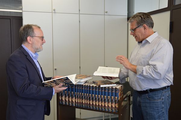 Zum 90. Geburtstag des Schriftstellers Martin Walser erschien am 24. März die „Gesamtausgabe letzter Hand“ seiner Werke – 25 Bände mit insgesamt rund 11.450 Seiten. Dr. Andreas Meier, apl. Professor für Neuere Deutsche Literaturgeschichte an der Bergischen Universität Wuppertal, verantwortete hierfür das editorische Konzept, die Herausgabe und textliche Durchsicht. Jetzt hat Prof. Meier ein Exemplar der Ausgabe an die Wuppertaler Universitätsbibliothek übergeben.