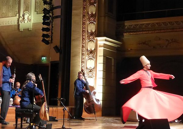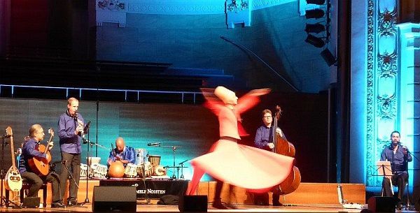 Endlich kommt zu Musik von Osmanli Murat III (Sultan des Osmanischen Reiches, 1546-1595) der Derwisch Talip Elmasulu in schwarzem Mantel und charakteristischem hohem Hut auf die Bühne, legt den Mantel ab und beginnt, sich in seinem roten Kostüm zu drehen. Die rhythmisch komplizierte, melodisch einfachere Musik, zu der auch immer wieder gesungen wird, versetzt den sich ständig mit fliegendem rotem Rock drehenden Derwisch in Trance und erleichtert ihm die unmittelbare Gotteserfahrung, die Sufisten wie christliche Mystiker suchten. Schwindel scheint der Derwisch jedenfalls nicht zu kennen. Und nach der Pause tanzt er zu „Askinile aiklar“ („Auf dem Weg zu Gott“) und hört auch nicht auf, als Robert Mäuser auf der Orgel J.S. Bachs Choralbearbeitung „ Christe, aller Welt Trost“ intoniert. Sufis beten mit dem Herzen wie J.S. Bach auch. Endlich erklingt Bachs große, hochkomplexe Fantasie g-Moll (BWV 542) mit mächtig einherschreitendem Pedalbaß, die gesamte Harmonik und Himmelskathedrale ausfüllend. Zuletzt werden die alten Lieder „Herr der Welt“ (jüdisch) und „Ozean der Liebe“ (sufisch) erst nacheinander, dann bei nur geringen Änderungen zusammen gespielt und unter Führung der Orgel musikalisch zusammengefaßt. Insgesamt ein hochpolitischer Abend, der die aktuell wie historisch blutigen Konflikte der Religionen vergessen lässt.