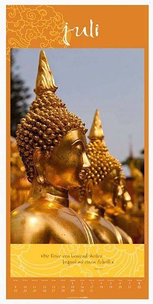 „Ein süßes Wort erfrischt mehr als Wasser und Schatten.“ Dieses Buddha zugeschriebene Zitat ist eine von zwölf ewigen Weisheiten, mit denen dieser Kalender im Monatswechsel seiner Besitzerin, seinem Besitzer Hinweise für das Jahr mitgibt. Auf großformatigen Monatblättern (68 x 33 cm) begleiten asiatische Sprichworte, Worte von Buddha und Laotse, aber auch von dem 14. Dalai Lama, von Mahatma Gandhi und anderen mehr Fotografien von Ruhe und Einkehr ausstrahlenden Buddha-Statuen.
