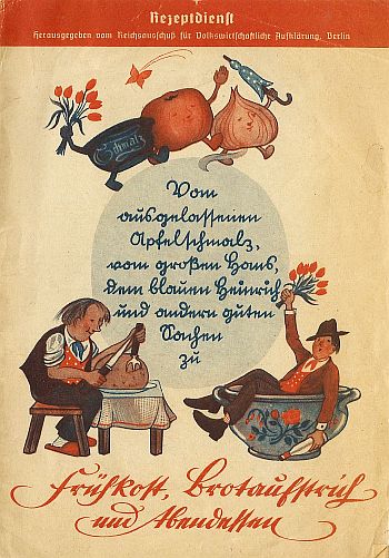 Die Not machte erfinderisch. Berühmt ist Adenauers Notbrot mit Mais, Gerste oder Graupen, das er als Erster Beigeordneter in Köln backen ließ, spöttisch auch als „Graupenauer“ bezeichnet. In zahlreichen Kochbüchern werden Rezepte veröffentlicht, die dem Mangel durch die Verwendung von Ersatzstoffen begegnen wollen. Solche „Notkochbücher“ aus einer Siegburger Privatsammlung sind bis zum 14.1.2018 im Museumsschaufenster zu sehen, Ihre Rezepte werden vorgestellt. Sie künden indirekt von der Not der Bevölkerung an der „Heimatfront“ im Ersten Weltkrieg. Anm.d.Red.: Das von uns gezeigte Beispiel des „Reichsnährstandes“ aus unserem Archiv stammt nicht aus dem 1. Weltkrieg, sondern aus dem Jahr 1944, als die Not dem „glorreichen“ Dritten Reich und dem von ihm angezettelten 2. Welkrieg geschuldet ähnlich groß wurde.