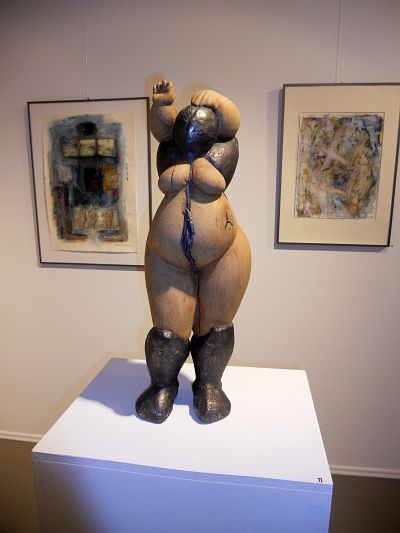 Die gegenwärtige Schau im Kunstverein Langenfeld ist im wesentlichen der keramischen Skulptur vorbehalten. Erstmalig zeigt die Künstlerin auch ihre großformatigen Zeichnungen und Mischtechniken. 19 Skulpturen und 29 Arbeiten auf Papier werden der Öffentlichkeit vorgestellt. Elke Tenderich-Veit hat ihre Schau mit ARENA betitelt – Arena als 'Kampfplatz', als großes zirzensisches Theater, als ein Ort, wo Menschen aktiv sind und andere zuschauen. So läßt die Künstlerin ihre Skulpturen – überwiegend im Bereich von 50 bis 100 cm Größe - im Ausstellungsraum wie in einer Arena agieren, die großformatigen Blätter an den Außenwänden bilden dazu eine Kulisse. Der Betrachter hat einen guten Blick auf das Treiben in der Arena. Es werden überwiegend Arbeiten aus den letzten beiden Jahrzehnten präsentiert. Dominant das Thema Zirkus-Kunst – Seiltanz, Handstand oder Balancen auf einer Kugel. Die Menschen im Zirkus, aber auch die gezeigten Ganzkörper-Figuren sind durchweg weiblich und von beachtlicher körperlicher Fülle, die in ihrer physischen Präsenz jedoch stets ein ästhetisches Maß finden. Jede dieser weiblichen Skulpturen zeugt vom Willen der Künstlerin, ihre Frauengestalten als aktiv agierende, emanzipierte Persönlichkeiten zu zeigen. Dabei geht es Tenderich-Veit bei den gezeigten Porträts um den Typ, nicht um Individualität, das schließt Verletzbarkeit an Körper und Seele nicht aus. Die Künstlerin hat sich längere Zeit mit der in der Spätfolge der in den 68er-Jahren entstandenen Sub-Kultur auseinandergesetzt, etwa der Punk- Bewegung. Junge Leute, denen alles zuwider war, was einengte. Diesen letztlich orientierungslosen Nonkonformismus hat die Bildhauerin mit Halbmaske bzw. dicker Brille vor den Gesichtern versinnbildlicht. Erwähnenswert ist noch, daß sich Tenderich-Veit nicht nur des Erdmaterials „Ton“ bedient, sondern auch mit naturgewachsenem Material wie Leder, Filz und Federn experimentiert, aber auch Ton mit Blei kombiniert.