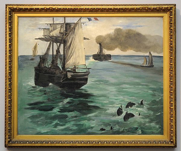 Obwohl Manet insbesondere seit Mitte der 1870er Jahre hinreißende impressionistische Bilder gemalt hat und von den Impressionisten als ihr Anführer betrachtet und als solcher verehrt wurde, hat er sich selbst nicht als Impressionist verstanden und auch nie gemeinsam mit den jüngeren, vom Salon zurückgewiesenen Freilichtmalern ausgestellt. Ein Sujet, das für impressionistische Zugriffsweisen wie geschaffen erscheint, ist das Meer mit dem fluiden Charakter des Wassers, mit ephemeren Wolkenbildungen und dem oft schnellen Wechsel der Beleuchtung, was einen spontanen, flüchtigen, skizzenhaften Malstil geradezu herausfordert. In jungen Jahren hatte Manet eine Karriere bei der französischen Marine in Betracht gezogen und war sechs Monate mit einem Segelschulschiff nach Brasilien unterwegs gewesen. Daß er seine Pläne änderte und Maler wurde, tat seiner Faszination für die See und alles Maritime freilich keinen Abbruch, wie das Kapitel „Manet und das Meer“ zeigt. Die Wuppertaler Ausstellung überrascht mit einigen kaum bekannten, in gedeckten Farben unter Verwendung von reichlich Schwarz gehaltenen Seestücken, Strandszenen und Hafenbildern. Dazu gehört auch ein kleines Aquarell der „Kersarge“, jenes berühmten Schlachtschiffs der amerikanischen Nordstaaten, das im Jahr 1864 vor Cherbourg das gefürchtete Kaperschiff „Alabama“ der südlichen Sezessionsstaaten versenken konnte. Manets großartiges, in Philadelphia befindliches Ölgemälde dieser legendären Seeschlacht, die für zahllose Schaulustige ein Riesenspektakel war, stand für Wuppertal leider ebenso wenig zur Verfügung wie eine der vier Fassungen der „Erschießung des Kaisers Maximilian von Mexiko“ aus den Jahren 1868/69. Thematisiert wird hier das unglückliche Ende des von Kaiser Napoleon eingefädelten mexikanischen Abenteuers der Errichtung eines von Frankreich abhängigen mittelamerikanischen Kaiserreichs. Manet, der aus einer großbürgerlichen Familie stammte, war überzeugter Republikaner und erklärter Gegner der Monarchie. In Napoleon III. sah er den Hauptverantwortlichen für das mexikanische Debakel und verlieh einem der Angehörigen des Exekutionskommandos, dem Büchsenspanner am rechten Bildrand, die Züge des französischen Kaisers, so daß in Frankreich wegen der herrschenden Zensurbestimmungen weder eines der Gemälde Manets noch die jetzt in Wuppertal ausgestellte Lithografie gezeigt werden konnten.