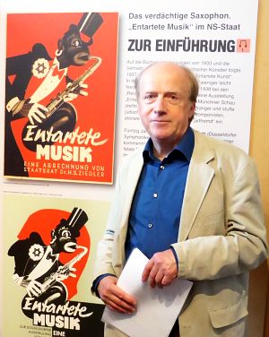 1988 hatten Peter Girth und Dr. Albrecht Dümling die Ausstellung von 1938 rekonstruiert. Sie war aus dem öffentlichen Bewußtsein fast verschwunden. 2008 wurde sie nach erneuter Be- und Umarbeitung in Düsseldorf (siehe http://www.musenblaetter.de/artikel.php?aid=1831& ) und wird in Deutschland wie im Ausland (englische Version) immer wieder gezeigt. Jetzt ist sie seit dem 28.01.2018 in Haus Kemnade (Bochum) zu sehen. Peinlich berührt entdeckt der Besucher auf einem Foto Richard Strauss in geselligem Gespräch mit Nazi-Größen und liest die Geschichte Paul Hindemiths, der vorübergehend in die Türkei auswandern mußte. Zahlreiche Musikerschicksale sind dokumentiert. Zur Eröffnung gab Albrecht Dümling eine kenntnisreiche und spannende Einführung. Ist Musik politisch? Wie hört das Publikum heute zeitgenössische Musik? Mauricio Kagel forderte 1988 eine „Organisation wie Amnesty international, die sich an Ort und Stelle gegen die Verteufelung der akustischen Kunst wenden sollte“. Ist Musik nicht gerade immer eine Mischung verschiedenster nationaler und regionaler Einflüsse gewesen? Schon Johann Joachim Quantz habe im 18. Jh. vom „vermischten Geschmack“ der deutschen Musik gesprochen, die aus verschiedensten Quellen gespeist worden sei. Unterdiesem Aspekt kann die Flüchtlingsbewegung seit 2015 als Chance für unsere Kultur begriffen werden. Die Eröffnung wurde musikalisch umrahmt von Hartmut Beifuß und seinem Trio mit Jazz aus den 20er und 30er Jahren, wozu das zahlreiche Publikums, rhythmisch vergnügt, in leichte Bewegung geriet.