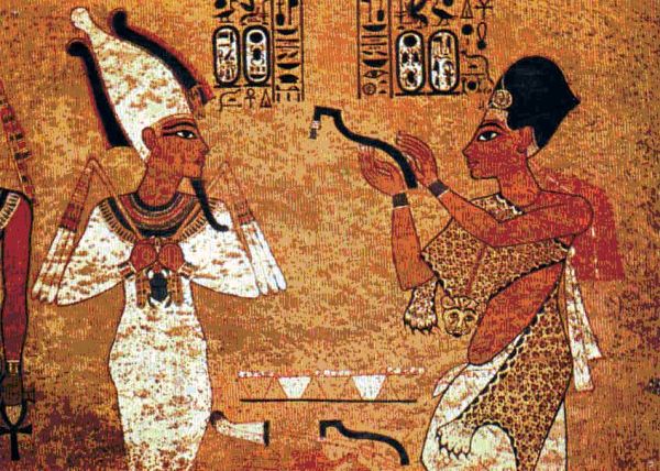 Das Bild der beiden Hohen auf Gold, die vergöttlichte Menschen sind oder Götter in Menschengestalt, ist eine ägyptische Grabmalerei aus dem Tal der Könige, bei Luxor. Zwei Pharaonen im Tete à tete nach der Machtübernahme auf dem Königsstuhl. Links, ganz in Weiß, Tut Ench Amun, mit seinem Tod unter die Götter versetzt, als einer der Ihren. Auf dem Kopf trägt er die Haube des Oriris, am Kinn seinen Knebelbart. Ihm gegenüber, stehend wie er, sein Nachfolger als Pharao, König Eje, das Leopardenfell über die nackten Schultern geworfen, ebenso wie das Diadem über der Stirn Zeichen der neu erworbenen Macht. Zwischen seinen zarten Händen im Rot des Lehms, aus dem wir Menschen sind, hält er ein schwarzes Gerät, eine Art Hebel. Mit ihm wird er Tut Ench Amun gleich den Mund öffnen, daß die Seele des Verstorbenen entweichen kann, die Seele eines Menschen, deren er unter den Göttern nicht mehr bedarf.