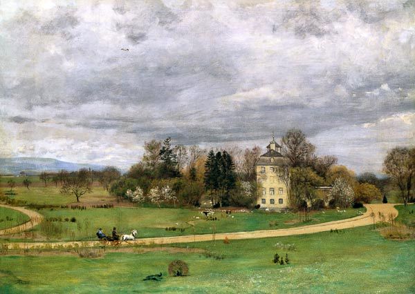 Doch auf der Natur, die der Maler Hans Thoma auf der Wende zum zwanzigsten Jahrhundert in Öl festhält, liegt die Hand des Menschen, auch wenn er selbst in figura so gut wie abwesend ist. Die Schmalseite eines dreistöckigen Gebäudes, in lichtem Gelb verputzt, beinah in der Farbe des Sandwegs. Das Mansarddach, mit Schiefer gedeckt, vor allem sein Türmchen, zeigt die Sprache späten Barocks. Ein Stadtschloß, inmitten eines kleinen Waldes, überragt von Laub- und Nadelbäumen. Solange sie, wie jetzt im Frühling, noch kein Laub tragen, kann die Architektur sich noch behaupten vor der Natur. Mit seinem Wäldchen füllt das Schloß den Mittelpunkt des Bildes, eine Insel gesellschaftlichen Lebens. Das dichte Braun und Grün um das Palais ist aufgehellt am Rand von weißblühenden Hecken der Schlehe, ehe es sich dann auflöst in das Wiesengelände, mit einzelnen Obstbäumen, Apfel und Kirsche, alle noch in der Nacktheit des Winters. Ein Bächlein schlängelt sich von der Schloßseite auf den breiten Sandweg zu, der ihn längst verschluckt hat. Der Passant/die Passantin im Einspänner wird gleich gar nicht mehr merken, daß es über Wasser geht.