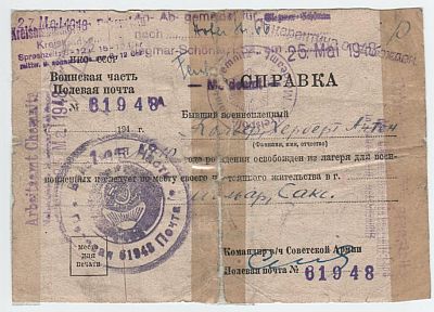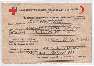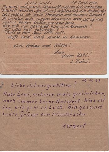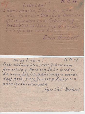 Im Nachlaß meiner Mutter, die im Dezember 1990 verstorben war, fand ich ein Kästchen mit einigen russischen Rotkreuz-Postkarten, die meine Mutter dann doch noch von meinem Vater aus dem Gefangenenlager bei Leningrad erhalten hatte. Sie hat diese Karten mir nie gezeigt, es war ein Stück ihrer Lebenserinnerung, die sie nicht teilen konnte oder wollte. Das Schicksal meines Vaters glich dem von Millionen deutscher Landser – Was Millionen Russen in deutschen Sammel-Lagern widerfahren war, fiel nun mit gleicher Härte auf die Deutschen zurück - mit einem Unterschied: die Bewacher prügelten und peinigten die Gefangenen nicht zu Tode. Wer floh, hatte sowieso keine Chance – im Sommer die unendlichen Sümpfe, im Winter Schnee und 25 oder 30 Grad Kälte und eine Bevölkerung, die keinem Flüchtenden half. Zur Sklavenarbeit - Lokomotiven mit Ölschiefer beladen - wurden die ausgemergelten Männer durch Leningrad getrieben und die russischen Bewacher mußten oftmals ihre Gefangenen vor der Rache und dem Haß der Bevölkerung schützen. Man muß wissen, daß Leningrad in der 900-tägigen Belagerung durch die Deutschen über 600.000 Hunger- und Bombentote zu beklagen hatte, mehr als der ganze alliierte Luftkrieg deutsche Zivilopfer forderte. Irgendwann Mitte 1946 war mein Vater als "o. K." (ohne Kraft) eingestuft und auf das Krankenrevier verlegt worden. Dort erhielt er erstmals seit der Gefangennahme im Mai 1945 die Möglichkeit, eine Rot-Kreuz-Karte an meine Mutter zu schreiben. Die Karte ist von fremder Hand geschrieben, weil er zu schwach war - nur die Unterschrift "Herbert" stammt von ihm. Die Männer wußten nichts von der Heimat, sie hatten nur gehört, daß es schwerste Kämpfe im "Reich" gegeben hatte und viele Städte ausgelöscht worden waren, aber nichts Konkretes. Die Krankenstation sollte meines Vaters Glück sein: Mein Vater konnte dann öfters einige belanglose Zeilen schreiben, immer betonte er, daß er gesund sei (was natürlich nicht stimmte). Im Dezember 1946 erhielt er erstmals auch ein lang ersehntes Lebenszeichen aus der Heimat. Ab Mitte 1947 „normalisierte“ sich der Postkartenverkehr über das Rote Kreuz. Auch das Leben im Lager wurde um ein Geringes erträglicher, aber der Hunger blieb natürlich. Die abgebildeten Karten belegen das, aber es ist ganz offensichtlich, daß die russische Zensur nur wenige Zeilen erlaubte. Dann, im Frühjahr 1948, besuchte uns ein entlassener Kamerad meines Vaters und überbrachte uns liebe Grüße. Meine Mutter war danach wochenlang krank vor Aufregung und dem Hoffen auf die baldige Rückkehr ihres Mannes. Am 22. Mai 1948 war es soweit - mehrmals hatten wir schon vergebens auf dem zerstörten