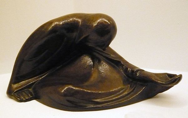 Dennoch kann sie sich, trotz ihres stummen Pathos‘, kaum behaupten gegenüber der ästhetischen Vollkommenheit der Umrißlinie. Die Oberfläche der Plastik ist poliert, daß sie glänzt. Man möchte mit der Hand über ihre schmeichlerische Glätte fahren.
