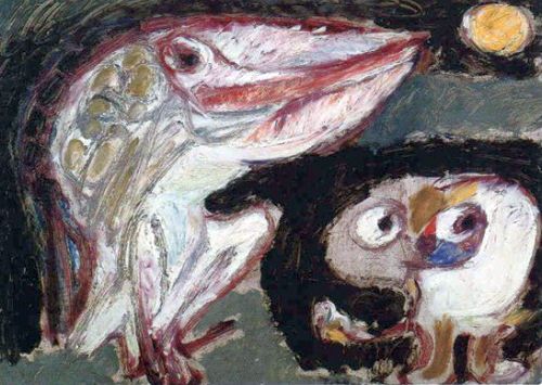Aber die beiden Tiere, die haben es in sich! Weißgrundig vor dem Dunkel der Nacht, plan gemalt, ohne perspektivische Tiefe. Links, das größere, auf dem Drittel der Malfläche, ein weißliches Schnabeltier. Ja, es besteht fast nur aus seinem mächtig breiten Schnabel. Die Grenze zwischen Ober- und Unterschnabel wächst sich aus zu einem Fisch, dessen schwarzes Auge zugleich dem Vogel als Auge dient. Dort, wo das Gehirn seinen Platz hätte, scheint ein quallenartiges Etwas durch - ein Lurch im fötalen Stadium? Die obere Umrißlinie dieses sonderbaren Vogels bildet seine Wirbelsäule. Die einzelnen Wirbel sind gut zu erkennen, von der Spitze des Schnabels über den Rücken bis zum Sitz des Tieres, auf lächerlich spinösen Froschschenkeln. Viel zu winzig für den Rumpf dieses Fabeltiers.