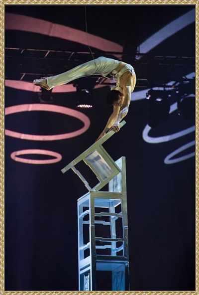 Eine Handstand-Nummer von den Bello Sisters, eine Luftdarbietung der zauberhaften Queens of Baroque, die durch ihr unglaublich schnelles Rotieren den Rezensenten schwindlig machen, lassen staunen. Und dann steigt Haitao Kong als Akrobat auf insgesamt 12, 13, vielleicht auch 14 weißgestrichene Stühle, stellt noch ein Gestell oben drauf und darauf noch acht weiße Holzklötze, um ganz oben in der Circuskuppel Handstände zu machen.