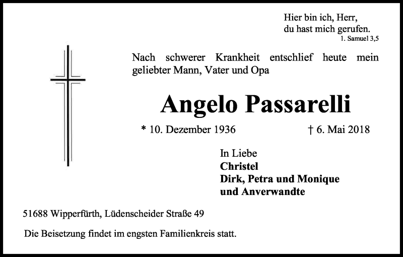 Angelo Passarelli war einer der ersten italienischen Gastarbeiter, die aus dem notleidenden tiefen Süden Italiens der Einladung folgten, in Deutschland Arbeit zu finden und beim Wiederaufbau der deutschen Wirtschaft zu helfen. Es war die Zeit, in der die deutsche Schlagerindustrie das Thema aufgriff und Hits wie „Zwei kleine Italiener“ (Conny) und „Marina“ (Rocco Granata) produzierte. Seine erste Arbeit bekam er 1961 im Werk II der Firma Bisterfeld & Stolting in Egerpohl bei Wipperfürth, einem Kunststoff herstellenden Betrieb (Biralit). Ich lernte als Bursche von 14 Jahren den liebenswerten, gut aussehenden und bescheidenen jungen Mann auf dem Bahnsteig am Haltepunkt Egerpohl der Bundesbahn kennen, von wo er nach der Arbeit mit dem Schienenbus zurück nach Wipperfürth fuhr, wo er in der Lenneper Straße ein kleines möbliertes Zimmer hatte. Ich erinnere mich gut daran, wie beeindruckt ich bei einer Einladung dorthin von dem aufrechten Wesen und guten Charakter Angelos war, der sich ehrlich um meine 17-jährige Schwester bewarb. Ich habe ihn, der seine Heimat hinter sich gelassen hatte, bewundert und hätte ihn gerne als Schwager gehabt. Es sollte schließlich nicht dazu kommen. Aus einer sentimentalen Anwandlung habe ich heute versucht, ihn wiederzufinden – und bin auf die Nachricht seines nur wenige Tage zurückliegenden Todes gestoßen. Ich bin unendlich traurig. Ciao, Angelo! Ich werde Dich nicht vergessen.