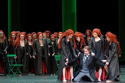 Diese vermeintlich heitere Lesart findet ihren musikalischen Widerpart in der luziden Auslegung der Partitur durch GMD Stefan Soltesz. Man kann ihm nicht genug danken, daß er sich endlich der Mode widersetzt und nicht der Pariser Fassung in ihrer Tristan Schwülstigkeit den Vorzug gibt, sondern sich konsequent der frischeren Dresdner Fassung widmet. Nicht zuletzt die Essener Philharmoniker danken es ihrem General: Selten kam wohl eine Wagner-Partitur strahlender und duftiger daher als an diesem Samstag. Als sei es eine der besten Partituren Bellinis strahlt der Essener Tannhäuser von einer Italianità, daß es eine Wonne ist, das tupfig frische Brio der Streicher, der edle dunkle Klang der Celli, die perfekten Holzbläser und die phänomenalen Hörner, sie weben ein federleichtes Bett aus Tönen, das die Stimmen leicht und sicher trägt. In der Prämisse, daß 1845 der uns bekannte schwere "Wagnerheld" noch nicht erfunden war, besetzt Soltesz die Titelpartie bewußt mit einem schlanken italienischen Helden und in Scott MacAllister hat er einen Idealinterpreten gefunden. Selten hat man in letzter Zeit wohl eine Interpretation von strahlenderem Belcanto erleben dürfen, mühelos bewältigt der junge Amerikaner jede noch so gewaltige Klippe seiner Partie und hat selbst für die Romerzählung noch soviel Reserve, daß er imstande ist diese zu "singen" und nicht, wie leider heute so oft üblich, zu deklamierten. Dabei trübt kein forcierter Ton das Gesamtbild, eine nicht hoch genug zu lobende Leistung. Gleiches gilt für "seine" Elisabeth: Danielle Halbwachs, die gerade noch als Chrysothemis in Essen zu überzeugen wußte und hier auch schon vor Jahren eine stupende Agathe sang, dürfte als Elisabeth zur Zeit ihresgleichen suchen. Im jubelnden Überschwang bewältigt sie die Hallenarie ebenso wie die heiklen Schärfen des zweiten Finales, wo sie wie ein Fels in der Brandung, das Ensemble überstrahlt, um dann im dritten Aufzug mit zartesten Tönen innigster Liedinterpretation eine erschütternde Preghiera zu gestalten. Ihr dunkler Gegenpart, Venus, hatte es da etwas schwerer, obschon von der Regie zugegeben recht stiefmütterlkich behandelt, Elena Zhidkova mit vollmundig sattem Mezzo gefiel. Zwar sollte die Russin noch etwas an ihrer Aussprache feilen, aber wie sie die undankbare Rolle stimmlich bewältigte ohne in schrilles Keifen zu verfallen, sondern zur edlen Kantilene fähig war, verlangt hohes Lob.