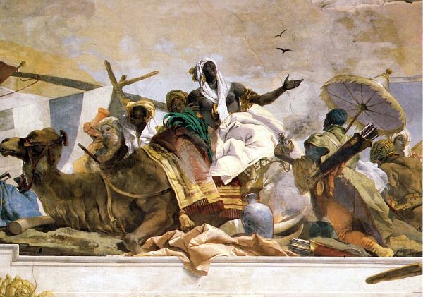Afrika! Dicht drängt sich das Leben der Menschen des sogenannten Schwarzen Kontinents, in barocker Opernseligkeit ausgebreitet. Die schwarze Frau, in gleißend weißes Tuch gehüllt, der Busen bloß - in göttlicher Nacktheit sitzt sie, eine Königin der Sinnlichkeit, auf einem Gebirge von Kamel, umdrängt von Männern, Frauen, verschleiert oder nicht, wie sie Gerätschaften herbeischleppen von geheimnisvoll fremder Art: Der Lederköcher voller Pfeile auf dem Rücken des verehrend Hingeknieten, der Weihrauch räuchert, wie wir das von den drei Königen aus dem Morgenland kennen. Zwei Stoßzähne des Elefanten, das damals in Europa so begehrte Elfenbein, aus dem sich die zierlichen Kunstwerke schnitzen ließen, für Könige und Bischöfe. Alte Schriften in einem Ranzen – welche uns verschlossenen Weisheiten mögen darin verborgen sein? Über dem Zelt im Hintergrund, zum Schutz vor Sonne und Sand, spannt sich ein Himmel von diffusem hellem Braun, in dem Vögel kreisen – Vorboten eines Sandsturms, aus den Tiefen von Wüsten?