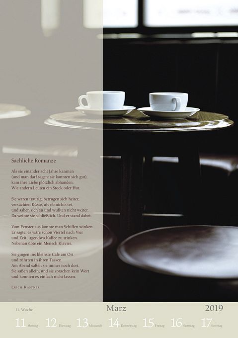 In Texten der internationalen Lyrik vereint dieser Wochenkalender auch für 2019 wieder 53 ausgewählte Gedichte von der Antike bis zur Gegenwart. Jedes der Gedichte wird von einer sorgfältig abgestimmten zauberhaften Fotografie begleitet. Bedeutende Dichter vieler Nationen und Epochen, darunter Gioconda Belli und Friedrich Hölderlin, Sarah Kirsch und Francois Villon, Joachim Ringelnatz und André Chenier, Nikolaus Lenau, Erich Kästner, William Shakespeare u.v.a.m. sind in dieser höchst erbaulichen Sammlung vertreten. Jedes Blatt schenkt einen wunderbaren Anstoß für den gedankenvollen poetischen Einstieg in die Woche.