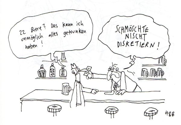 Oft genug geht es daneben, wenn zwei sich zusammentun, um gemeinsam ein Ding zu drehen, und auch von Ehen hört man das gelegentlich. Hier nun das Gegenbeispiel: (Elias) Hauck & (Dominik) Bauer, der erste für die treffsicher uneleganten Zeichnungen verantwortlich und der zweite für die hintersinnigen Kurztexte dazu. Die beiden tun das nun schon seit 15 Jahren. Erste Meriten haben sie sich seit 2003 durch ihre wöchentliche Kolumne in der Frankfurter Allgemeinen Sonntagszeitung verschafft und damit zugleich bewiesen, daß Provinzpflanzen nicht im Kleinstadtmief untergehen müssen. Beide wurden nämlich 1978 im damals 14.525 Einwohner zählenden hessischen Alzenau geboren. Der Ort hat heute knapp 20.000 Einwohner, inwieweit Hauck & Bauer dafür haftbar zu machen sind, ist nicht bekannt. Hat der eine (Hauck) schon vor wenigstens einer Dekade die Flucht in die Hauptstadt angetreten, ist der andere (Bauer) so leicht nicht abzunabeln, er wohnt heimatnah in Frankfurt/Mainhattan, immerhin auch in einer Großstadt.