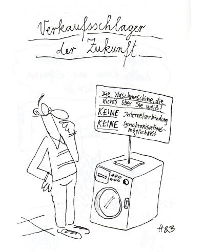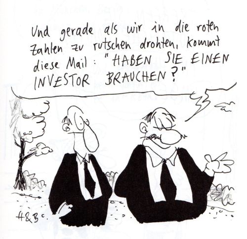 Wenden wir uns der Analyse Hauck & Bauerschen Schaffens zu: Da betrachtet ein Mann (siehe oben) mit sichtlicher Freude den Verkaufsschlager der Zukunft: Die Waschmaschine, die nichts über uns weiß – keine Internetverbindung, keine Synchronisationsmöglichkeit. Angesichts der Messe für Consumer Electronics und Home Appliances IFA, die vor einer Woche in Berlin zu Ende ging, ein Licht der Hoffnung in der Düsternis künftiger globaler Vernetzung. Hauck & Bauer haben die Zeichen der Zeit erkannt und legen den Finger in die Wunden. Haben sie nicht auch schon einmal einen Telefonanruf oder eine E-Post bekommen, in denen Ihnen mit afro-englischen Swing in der Stimme oder kurioser Orthographie eine lukrative Geldanlage angeboten wurde? Unsere beiden Humoristen kennen auch dieses Phänomen und bringen es auf den Punkt: „Haben Sie einen Investor brauchen?“ Wir liefern den Cartoon dazu: