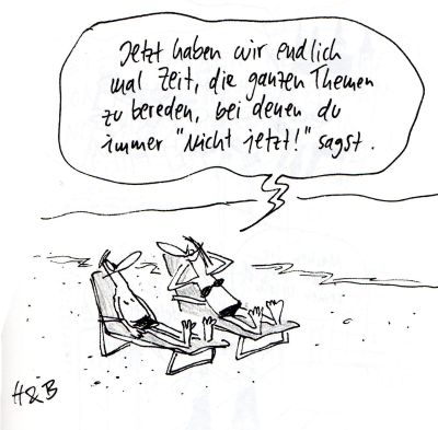 Hauck & Bauer machen einfach ganz prima Witze auf Ihre und auf Ihre und besonders auf meine Kosten. Das erzeugt Erkenntnis, befreiendes Lachen und das gibt es seit Jahren mehrfach in Buchform, jetzt mit neuen und gesammelten Werken, bewährt wieder beim Verlag Antje Kunstmann in München. Die Späße in dem ab heute in den Buchläden ausliegenden Band „Ist das noch Entspannung oder schon Langeweile“ sind an herrlichem Blödsinn wie auch verblüffenden Wahrheiten kaum zu übertreffen und verantwortlich für die gute Laune des Rezensenten, der über der Lektüre gestern sogar das Mittagessen anbrennen ließ.