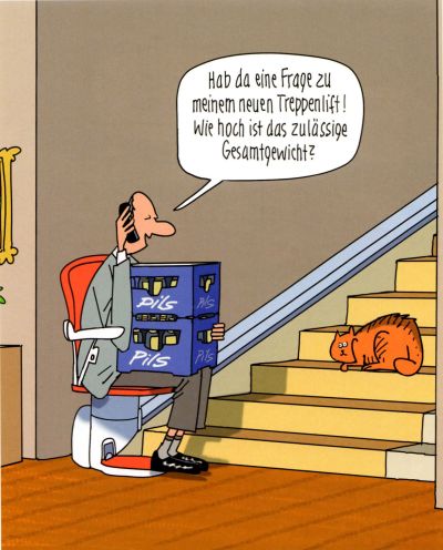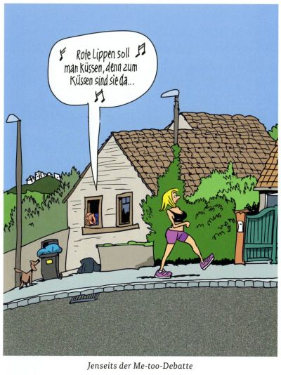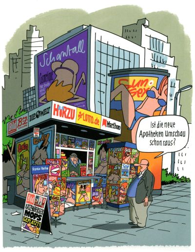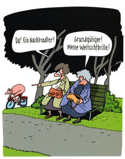„Wenn man plötzlich nach dem zehnten Bier auf die Toilette muß, beim Tanzen die Gelenke im Rhythmus der Musik knacken und die Darmspiegelung spannender ist als ein Krimi - dann ist man älter geworden. Kein Wort ist in der deutschen Sprache allerdings so verhaßt und verdammt wie „alt“. Es bedeutet im allgemeinen Verständnis Verfall und Friedhof. Niemand findet die Idee attraktiv zu verfallen und weiße Haare, gelbe Zähne und tiefe Falten zu bekommen. Ein Heer von Chirurgen und Chemikern tut alles, um dem entgegenzuwirken. Heute sitzt in einer Talkshow die Neunzigjährige mit praller Oberweite und schneeweißen Zähnen, Opas joggen mit künstlichen Gelenken durch die Parks und Mütter von zwölf Kindern haben die Figur einer Sechzehnjährigen. Jugendwahn, wohin man schaut, egal, ob man noch 30 oder 3 Jahre bis zur Rente hat. Nur Mick Jagger irritiert mit einer verstörenden Mischung aus Fitness und Faltenfresse. Aber muß es so laufen? Schauen wir doch mal auf den berühmten bretonischen Fischer: ein Gesicht, von der Lust auf Leben geprägt, von der Sonne gegerbt, vom Meer gebürstet, vom Wein beschwingt, von der Liebe geküßt und mit genug Zähnen, um die Zigarette im Mund zu halten. Wer also möchte man im Alter sein? Das muß jeder für sich entscheiden. Ich jedenfalls habe mich entschieden, dieser unentrinnbaren Entwicklung im Leben eines Menschen dieses Cartoonbuch zu widmen. Typisch für meinen Verlag, daß er bei diesem Thema mit demoskopischem Blick sofort ein gutes Geschäft witterte und meine Entscheidung dementsprechend wohlwollend begrüßte. Mir jedoch oblag nun die schwere Aufgabe, den Spagat zwischen Alter und Spaß hinzubekommen, welcher der älteren Generation in Wartezímmern und Warteschleifen zugegeben gründlich vergehen kann. Folglich nicht ganz einfach - aber schlau wie ich bin, habe ich mich des magischen Bindemittels Humor bedient.