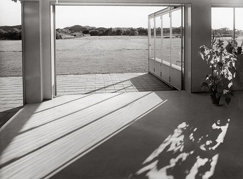 Photographie zum Ausdruck zu bringen. Mit einer eigens für Architekturaufnahmen angeschafften Linhof-Platten-Kamera 9 x 12 cm ist Eva Besnyö zwischen 1934 und 1939 unterwegs auf Baustellen und in öffentlichen und privaten Gebäuden, z.B. in den AVRO-Radio-Studios des niederländischen Rundfunks in Hilversum, im Cineac-Kino in Amsterdam, aber auch in privaten Villen und Sommerhäusern wie dem Haus in Groet in Nordholland. Bei diesen Aufnahmen zeugen rechte Winkel und Schrägen bis in die Fugen der Fußbodenfliesen oder die Muster der Korbsessel einmal mehr von der künstlerischen Handschrift der Photographin. Hier nutzt sie wie auch bei vielen ihrer anderen Architekturaufnahmen das gleißende Sonnenlicht und den Schlagschatten, aber auch jede andere Brechung der Lichteinwirkung.