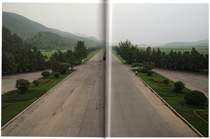 Mit dem einzigartigen Bildband „Inside North Korea“ begeben wir uns auf Wainwrights Spuren auf eine unwirkliche Reise in ein Land, das durch seine strikte Isolation – es gibt keine Internet-Verbindungen – förmlich aus der Zeit gefallen ist. Wainwrights Fotografien zeigen den ganzen Aberwitz des nordkoreanischen Systems in seinem Widerspruch zwischen staatlicher Doktrin und dem realistischen Alltag: Im wahrsten Wortsinn leer gefegte Straßen und Plätze (vgl. s. 86/87, 198/199), nahezu unbelebte Sportstätten und Stadien (S.148-152, 210-214), eine Überfülle von pathetischen Monumenten und Wandgemälden zum Ruhme der Kim-Dynastie (S. 86-101, 126, 160-165, 223-225, 234-241 u.a.m.) und tot wirkende Micky-Maus-Architekturen in den erwähnten Bonbon- und Pastellfarben. „Echte“ Menschen sind selten auf den Bildern zu sehen, meist erkennbare Inszenierungen. Da beeinduckt vor allem die Hoffnungslosigkeit, die aus Bildern wie auf Seite 198/99 spricht, wo man eine schnurgerade Landstraße zwischen gepflegtem Grün sieht, die sich menschenleer im Dunst der Ferne verliert und auf der ein einsamer Mann verlassen ins Nirgendwo zu gehen scheint.