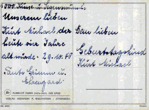 1948 bekam ich sie geschenkt, zu meinem vierten Geburtstag. Damit ist Dürers Hase einer der frühesten Nachweise meiner Existenz. Von den beiden Gratulanten, „Tante Grimm u. Ehrengard“, ist mir nur ein höchst verschwommenes Bild geblieben, am ehesten noch von „Tante Grimm“, der Schreiberin des Grußes.