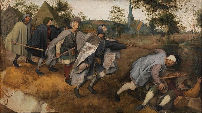 „Die Tolle Grete“ scheint das sie umgebende alptraumhafte Chaos zu beherrschen. Leicht hat sie es nicht, wenn zahlreiche bedrohliche Fabelwesen andere piesacken oder in Gänze verschlucken und im Hintergrund ein bedrohliches Feuer lodert. Mit kleineren Teufeln nimmt diese Grete es unerschrocken auf. Selbst das große Ungeheuer am linken Rand mit weitgeöffnetem Maul, in dem viele verschwinden, schaut skeptisch auf diese tolle Frau. Parallelen zu Hieronymus Bosch sind unabweisbar. Ob sie verheiratet ist? Über Bruegels Ehefrau ist nichts bekannt. Karikiert ein misogyner Pieter Bruegel hier etwa seine streitsüchtige bessere Hälfte? Ist das Gemälde von 1563 feministischer Interpretation zugänglich? Reine Spekulation, und lustig ist das Gemälde jedenfalls nicht. Auch nicht die bedrohlichen „Imker“ von 1568. Sie erscheinen rätselhaft und unheimlich in ihren Kutten und vorne mit Geflecht verschlossenen Kapuzen wie Arbeiter eines nuklearen Zwischen- oder Endlagers. Jedenfalls sind Bienen nicht zu entdecken. Rechts ist einer in den Baum geklettert, als hielte er Ausschau, damit die Imker nicht bei einer Untat erwischt würden. Auf der Tafel „Der „Blindensturz“ stolpern von links oben nach rechts unten sechs Blinde mit ihren Blindenstöcken und leeren Augenhöhlen hintereinander her. Der erste ist schon gestürzt, der zweite im Begriff zu fallen. Allegorie des Menschen in seiner Blindheit und Unbeholfenheit? Welch ein Menschenbild! Die Kirche im Hintergrund hilft hier auch nicht mehr, und daß mit solchen Kreaturen der Turmbau zu Babel gescheitert ist, leuchtet ein. Über Bruegels großartiges Bild dieser Wahnsinnstat könnte man ein eigenes Buch schreiben.