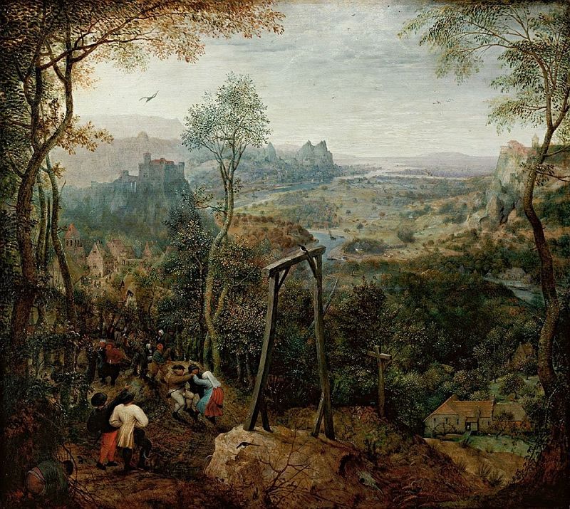 In Bruegels deftigen, volkstümlichen Darstellungen (z. B „Bauernhochzeit“) trübt sich die Stimmung subtiler ein. Saufen und Fressen, die Völlerei gehören zu den Todsünden, die zügellos nicht gescheut wurden. „Die Elster auf dem Galgen“ aus dem Jahre 1568 beobachtet die tanzende Gesellschaft auf dem Schindanger unter ihr. In der linken unter Ecke verrichtet jemand, wie menschlich, hockend seine Notdurft, während ein zweiter das Unterholz zwecks Pinkeln aufzusuchen scheint. In der Ferne breitet sich eine Gebirgslandschaft aus mit Burg, einem mäandernden Fluß und einem Dorf in der Bildmitte links. Auf den Blättern der Bäume im Vordergrund glitzert das Sonnenlicht. Wenn die Elster als Sinnbild der Geschwätzigkeit politisch gesehen wurde, könnte sie den Betrachter in Zeiten der Inquisition auf die Gefahr durch Denunziation hinweisen, durch die Idylle bedroht wird. Immerhin sitzt sie auf dem Galgen, der allerdings in einer eigenartigen Perspektive ungeheuer unsicher steht, oder wegläuft? Mit dem Bilderzyklus „Jahreszeiten“ werden auf fünf großformatigen Tafeln Menschen mit für die dargestellte Jahreszeit typischen Tätigkeiten in großartigen Landschaften dargestellt. Wie detailverliebt der Maler auch im fernen Hintergrund des Bildes Szenen malt, kann auf den Ausschnittvergrößerungen im Bildband sehr gut nachvollzogen werden, wahrscheinlich besser als bei Betrachtung der Originale im Museum.