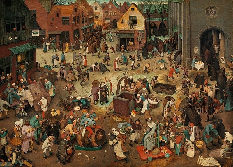Im „Kampf zwischen Fasching und Fasten“ (1559) wird allumfassender Streit manifest: Mann gegen Frau, dick gegen dünn, Fleisch gegen Fisch, Lärm gegen Ruhe, Klerus gegen sündige Welt, „katholisches Übel gegen protestantisches Fieber“ mit Luther als Prinz Karneval? In der Bildmitte finden sich Personen mit orthopädischen Hilfsmitteln – Gehstützen- bei z.B. Beinamputation. Klar, gehörte man damals zur falschen Seite, zur falschen Konfession, mußte man mit Folter, Verbrennung, Tod und Verstümmelung rechnen. Die Konflikte und Grausamkeiten des 16. Jahrhunderts werden hier deutlich.