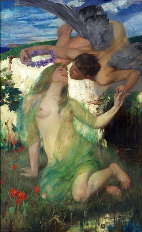 Passend zum Frühlingsanfang 2019 lockt der Kunstpalast mit dem frisch restaurierten Ölgemälde „Der Frühling küßt die Erde“ zu einem Besuch seiner Sammlung in den Ehrenhof. Das im Jahr 1894 von Alexander Frenz (1861–1941) geschaffene, 160 x 100 m große Werk präsentiert den Geist der vorigen Jahrhundertwende. Frenz ging nach Abschluß seines Studiums an der Düsseldorfer Kunstakademie für ein Jahr als Privatschüler zu Franz von Lenbach nach München. Auch nach seiner Rückkehr nach Düsseldorf blieb der Künstler seinen allegorisch-symbolistischen Gestaltungen treu. Seine fantasievollen Darstellungen machten ihn bekannt und verbreiteten seinen Ruf als „rheinischer Franz von Stuck“. Die Restaurierung von Frenz‘ Hauptwerk „Der Frühling küßt die Erde“ wurde von Vanessa Schwaderlapp, Masterstudentin am Institut für Restaurierungs-und Konservierungswissenschaft der TH Köln, durchgeführt. Sie wurde unterstützt von Inken Holubec, Restaurierungszentrum Düsseldorf, und Mitarbeitern der naturwissenschaftlichen Abteilung der TH Köln. Nachdem der Rahmen im Depot entdeckt und ebenfalls restauriert wurde, kann das Gemälde dem Publikum nun in seinem originalen Rahmen gezeigt werden.