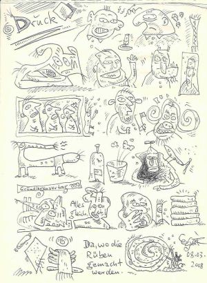 »Ja, was habe ich nicht alles in Angriff genommen: mißratene Kinder in Acryl, alte Damen in Bleistift, humorige Federzeichnungen von Königen, des Nachts sogar abstrakte Hähne und Gliederpuppen - alles Mist, alles von anderen schon längst viel besser gemacht! Während der letzten Tage habe ich mit kalten, aber feuchten Füßen das Bett gehütet, so hat mir der Kopf geschwirrt. Es ist ein Kreuz mit der Kunst. «