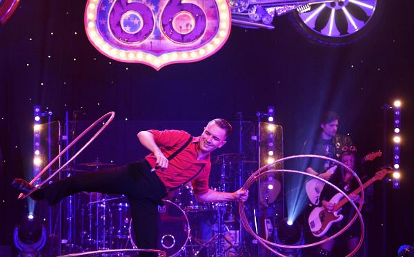 Eine Luftnetz-Nummer von Joao Godinho zeigt Artistik im Varieté-Himmel mit einem weißen Schiffsrumpf und Netz-Segeln. Dazu haucht das Ensemble „Rote Laterne“ in die Mikrofone. Lolitas „Seemann...“ und Marlene Dietrichs „Ich bin von Kopf bis Fuß ...“ sind weitere Lieder in der ersten Abendhälfte. Es folgt virtuoses Hula Hoop mit Igor Boutrine, der nicht nur einer der wenigen männlichen Artisten dieses Genres - es gelang ihm, auch dem Hula-Hoop durch irres Tempo, eine technisch brillante Choreographie und seine lässig dynamische Präsentation neue Dimensionen zu eröffnen. Ein zauberhaftes, manchmal leicht bekleidetes Ballett schmeichelt dem Auge, das Duo Attraction mit Hand auf Hand-Akrobatik verschmilzt in seinem Act die Disziplin Hand-auf-Hand-Akrobatik mit modernen Tanz-Elementen und erschafft so eine verzaubernde Leichtigkeit. Und dann wieder Rock n Roll: ein Medley mit Jerry Lee Lewis´ „Great balls of fire“, „Roll over Beethoven“ und „What I say“.