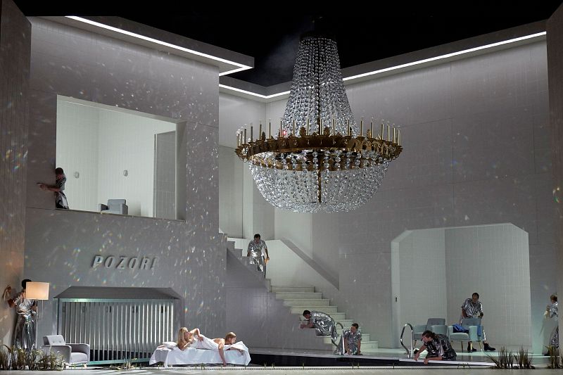 Christian Schmidt muß nicht immer nur Zimmer bauen, wie er es für Claus Guth regelmäßig tut, aber diese Szenerie verrät auch nicht, was sie ist und was sie will. Soll diese Halle mit Pool (den man vom Parterre aus nicht sieht) und großer Treppe eine Wellness-Anlage sein? Ein Sofa, eine Stehlampe, verschiedene Öffnungen zwecks verschieden angedeuteter Hintergründe: Wo ist man da? Die weißen Wände sind dazu da, daß sich in ihnen das Wasser spiegelt oder daß sie mit Farben bzw. Videosequenzen (das inzwischen wohl langweiligste aller Stilmittel) überzogen werden. Die Aufschrift „Pozor“ bedeutet übrigens, das Internet übersetzt: Achtung, Stillgestanden, oha! Ja, oha! Oha? Ach ja? Wie das?