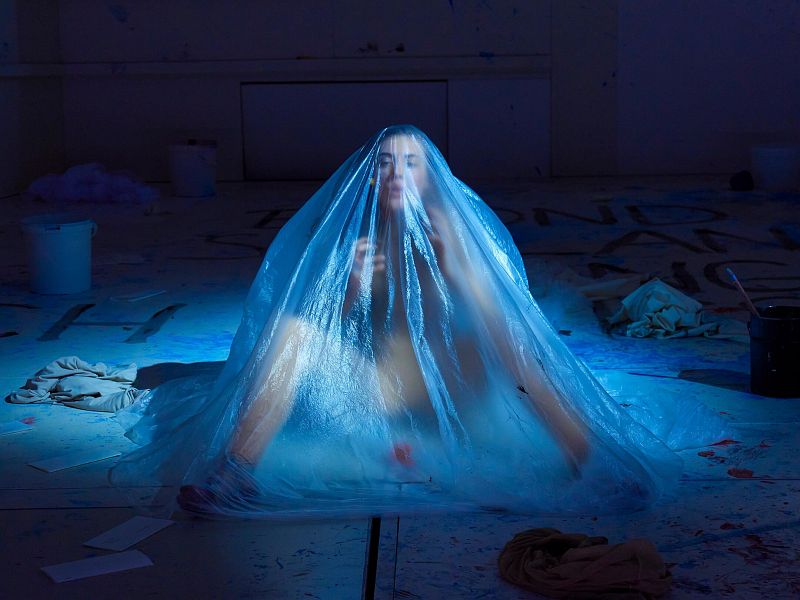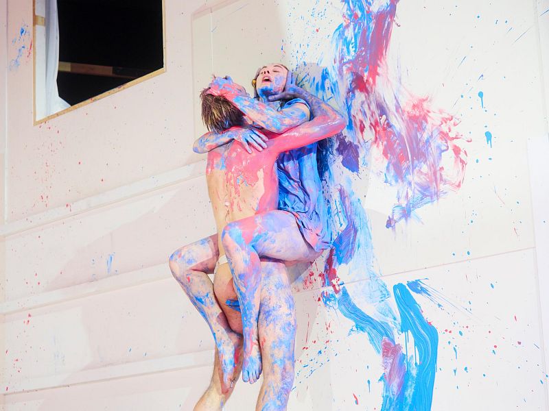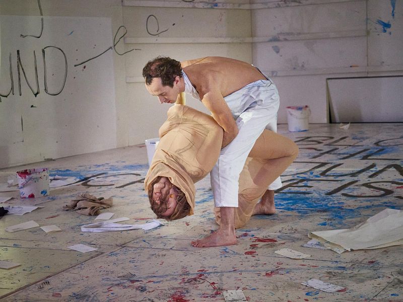 Einmal nur, ganz zu Beginn der Inszenierung zieht sich Lulu (Lieke Hoppe) aus, schaut dabei minutenlang ins Publikum, ganz so, als ob sie die Wirkung ihrer nackten Präsenz auf die Theatergänger erproben möchte. Dann kleidet sie sich wieder an und ist bis zu ihrem bitteren Ende stets mit irgendetwas bekleidet. Ihr erster Mann, Oberstaatsanwalt Goll (Andreas Grothgar) stirbt relativ schnell bei einem Kunsthappening, bei dem Lulu voll mit Farbe eingepinselt und dann - als Bodypainting - an die Wände gedrückt wird und Abdrücke hinterläßt.
