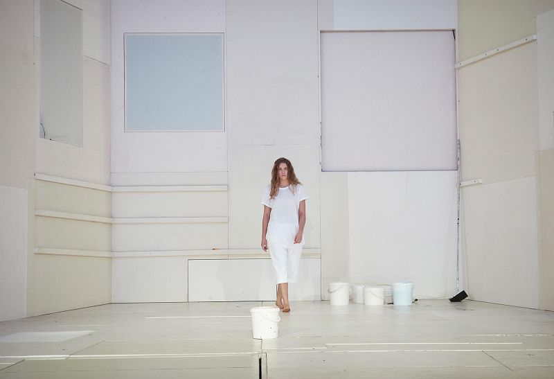 Die Bühne (Simeon Meier) ist ein einziger großer, weißer Kasten mit zahlreichen, notdürftig verschlossenen Öffnungen, aus denen Lulu immer wieder von Männern bestürmt wird. Mal springen sie sie an, mal brechen sie über sie hinein, mal kommen sie von unten und bedrängen sie, mal stürzen sie von oben auf sie ein. Auch das - möglicherweise - hat etwas mit Lulus Lebenswandel als männerverschlingender Vamp zu tun. Auch im sexuellen Sinn gibt sie sich in Düsseldorf nach allen Seiten offen.