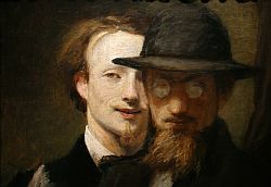 der Malerei. Aus dieser Zeit stammen Landschaftsbilder, Genrebilder von Pferden, aber auch schon das Selbstbildnis von 1855, welches mit hellem Gesicht, schmalem weißen Kragen und dunkler Jacke vor unbestimmtem Hintergrund einen selbstbewußten jungen Mann zeigt. Unterbrochen von einer kurzen Militärzeit lebte er seit 1857 in München und lernte dort u.a. Franz von Lenbach kennen. Das Münchner Doppelportrait Marees und Lenbach von 1863 aus der Neuen Pinakothek läßt Marées selbst als jungen Intellektuellen in vollem Licht seitlich hinter dem Gesicht Lenbachs erscheinen. Sein Gesicht mit Brille und Kinnbart wird von einem dunklen Hut beschattet. Bei der Entwicklung einer eigenen Malweise profitierte Hans von Marées vonAufträgen des Grafen von Schack, für den er zwei Jahre lang