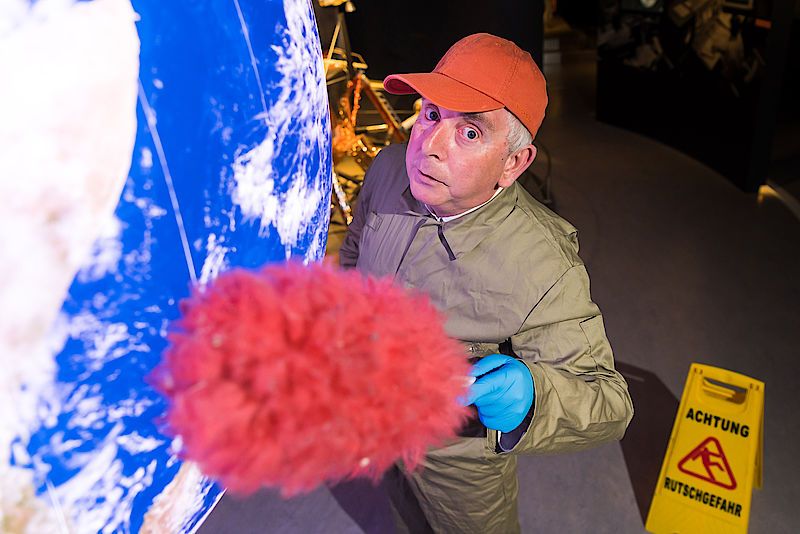 Das HNF konnte den legendären Paderborner Kabarettisten Erwin Grosche gewinnen, der in einem Video demonstriert, wie er in der aktuellen Ausstellung „Aufbruch ins All“ den „Dreck der Sterne“ beseitigt. Als Putzmann säubert er die Ausstellung, macht sich seine ganz speziellen Gedanken über die Raumfahrt und entdeckt dabei, was die Astronauten auf dem Mond so alles zurückgelassen haben. In der einzigartigen Erwin-Grosche-Art, der auch das Drehbuch schrieb, entführt er die Zuschauer ebenso unterhaltsam wie poetisch in die Weiten des Weltraums.