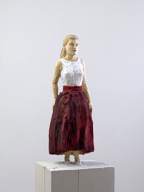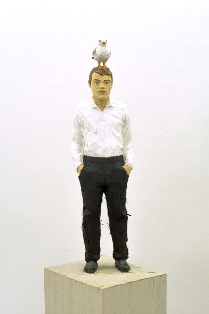 Balkenhol’s wooden figures are never identical with the physical dimension of their beholders. As oversized or miniature figures, they underscore their hyperreal model character and with their narrative attributes, cultural-historical quotations, and subtly varied postures they allude to an inherent puzzling quality that they possess that vehemently contributes to the openness of the artwork desired by the artist and the freedom of its interpretation. The structural characteristics of the raw piece of wood determine the course of Balkenhol’s creative process to a great degree. They animate the complete figure to the same extent as the artistic formation and the beholder’s perception. The important role Balkenhol attributes to the material can be read in the frequent use of the uncarved wood as a pedestal. The conserved shavings and splinters of wood that counter the smoothing coat of paint on Balkenhol’s colored sculptures and reliefs also communicate a surface materiality, lending the figures, like visual worlds that are dabbed impressionistically and fleetingly, an impression of vitality and suggesting a romantic sense of fateful human imperfection. Balkenhol does not hide the traces of his artistic work – they remain as key elements of composition and help in the thematic charging and release of his art.