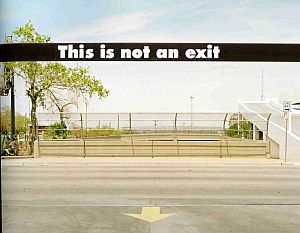 von Plätzen, Straßen und Gegenden mit deutlichen Zeichen der Verwahrlosung dramatisch die innere Leere ausdrückt. Wir sehen riesige Billboards in verwaisten, trostlosen Landschaften, die wie verzweifelt Botschaften transportieren: "Big Bang Theory - You´ve Got To Be Kidding - God" (eines von vielen Produkten der "Billboard Ministry"). Wir sehen einen jungen Mann, der zwar bereit ist, das Kreuz aufzunehmen, doch die wirkliche Last es zu tragen mit einem angeschraubten Rädchen vermeidet. Soviel zum Stichwort Bigotterie. Der Mythos von Alamo blättert ab, der Mythos um John F. Kennedys Tod aber lebt in Kritzelein und Graffitis an einem Bretterzaun in Dallas weiter. Andersons Molkerei sponsort eine Aufforderung der North Temple Baptist Church, sich nicht dem Begehren hinzugeben und allenthalben werden Star Spangled Banners herumgetragen wie hierzulande nur bei Fußballmeisterschaften. Wie verloren und sich offenbar nichts zu sagen habend erwarten zwei junge Frauen in einer leeren Sporthalle rechts und links von einer großen Plakatwand mit der Aufschrift "Welcome Home" vielleicht die Rückkehr ihrer Männer aus dem Krieg. Eher zufällig mahnt an anderer Stelle ein Parkaus-Hinweis "This is not an exit" und gleich daneben, ganz klein die Einsicht "One Way".