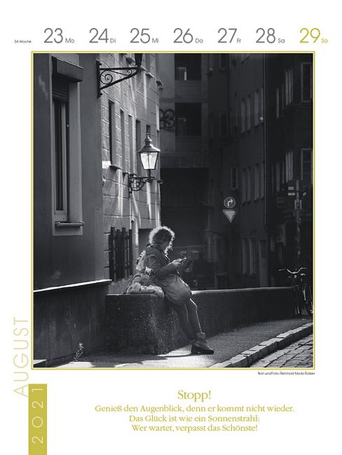 Wir sind, genau betrachtet, in vielen Phasen unseres Lebens Wartende. Doch worauf warten wir eigentlich? Allzu oft ist es das Unerfüllbare. Ein Kalender mit stimmungsvollen Fotos und anregenden Texten von Reinhold Maria Ratzer gibt Woche für Woche für ein ganzes Jahr Fingerzeige und Anregungen, das Warten in Erkenntnis zu verwandeln und ein ganz klein wenig sinnvoller zu leben. Denn jetzt und hier findet das Leben statt, genießen wir es also. Wir sind durchaus in der Lage, Illusion durch Erfüllung zu ersetzen, wenn wir uns positiv einstimmen und Nektar aus den kleinen Dingen, den hellen Stunden und der Schönheit der Welt saugen.