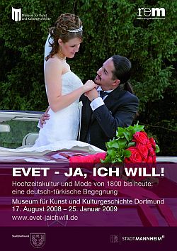 Dortmund - Ein weißes, mit Schmuckperlen besticktes Brautkleid von 1962 aus Istanbul und eine reich dekorierte, mit einer Krone versehene Lindhorster Brauttracht aus dem Jahr 1920 sind nur zwei von vielen Exponaten, die ab dem 17. August im Dortmunder Museum für Kunst und Kulturgeschichte zu sehen sein werden. Die Aussteller, die unter dem Titel "Evet - Ja, ich will!" bis zum 25. Januar nächsten Jahres gezeigt wird, stellten erstmals Gegenstände vor, die von türkischen und deutschen Frauen nach einem Aufruf des Museums für die Ausstellung zur Verfügung gestellt wurden. Dabei handelt es sich hauptsächlich um Brautkleider, Tücher und Brautsträuße. Deutsche und türkische Hochzeitskleidung der letzten beiden Jahrhunderte in ihrer regionalen Vielfalt, ihrer städtisch-bürgerlichen Ausprägung und mit ihren heutigen Modetrends steht denn auch im Mittelpunkt der Schau, wie die stellvertretende Museumschefin, Gisela Framke erklärte. Etwa die Hälfte der Exponate stammt aus den großen Museen der Türkei und Deutschlands. Die übrigen Stücke die zu sehen sein werden, stammen von Privatleuten. Auch viele Hochzeitsfotos und Filmausschnitte von Trauungen, Hochzeitsfeiern und Polterabenden werden zu sehen sein. "Die authentischen Hochzeitsgeschichten von türkischen Mitbürgern und Deutschen bereichern packend und informativ die Ausstellung", so Projektmitarbeiterin Sevgi Sarikaya. Eine der türkischen Frauen brachte auch das rote Band mit, das sie bei der Trauung vor vielen Jahren