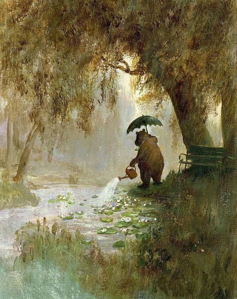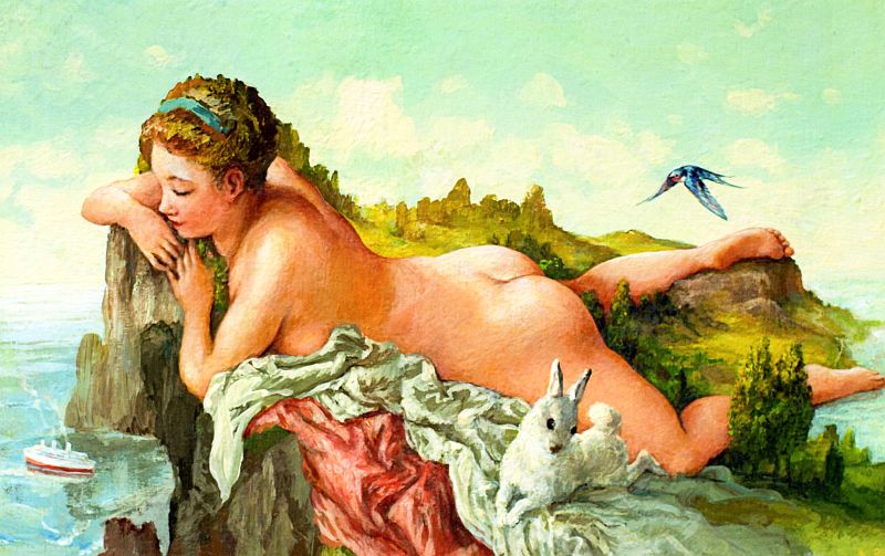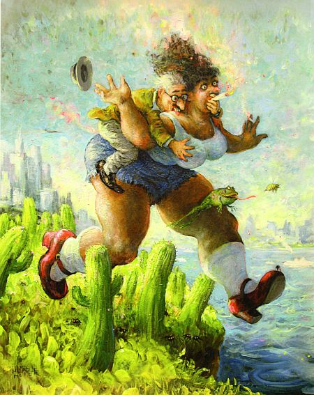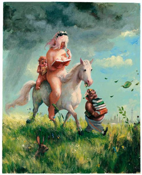 Dramatische Gebirgslandschaften, Schaurige Schauspiele, prächtige Pferde, üppige Weiber, Unterwasserwelten, Adaptionen der Malerei der Romantik und des Impressionismus, aber auch Besuch bei Zeitgenossen, Stilleben, Dramen, Alpträume und Nachtmahre, Bärenspäße und Tierleben – Das Werk des Malers, Cartoonisten, Satirikers und Kunstkritikers Rudi Hurzlmeier (*1952) ist vielfältig. So vielfältig, daß eine komprimierte Zusammenfassung nur eine Annäherung sein kann. In der verdienstvollen Kunstmann-Band der Reihe „Meister der komischen Kunst“ ist vor neun Jahren, wenn auch schmal, zumindest schon einmal eine Annäherung gelungen, die staunenswerte Vielfalt seiner Cartoons, Witze, Comics und Ölbilder, die ihn so besonders macht, anzureißen. Es sind vor allem seine überbordende Phantasie, die häufig die Trennlinie zur Boshaftigkeit überschreitende Satire und die über vielen Arbeiten liegende tiefe Melancholie. Rudi Hurzlmeier karikiert damals z.B. Georg Christoph Lichtenberg - und könnte selbst einer von dessen Art sein. Er treibt Scherz mit Vincent van Gogh (Der Hosendieb), ironisiert das Motiv von Francois Bouchers „Ruhendes Mädchen“ (1752) für sein „Mädchen am Meer“ (auch unter dem Titel „Little Mermaid“) oder setzt das Lady Godiva-Motiv für seine „Lesereise“ um - und zeigt damit gleichzeitig seine Lust am Schauen, an der Üppigkeit und die Liebe zum Öl. Der, nämlich der Ölmalerei Hurzlmeiers, ihrer detailverliebten, beunruhigenden Bilder- und Alptraum-Welt widmet der Verlag Antje Kunstmann – Lappan (2014) und Holzbaum (2016) haben vorgelegt - einen noch opulenteren neuen Bildband, der heute in die Läden kommt.