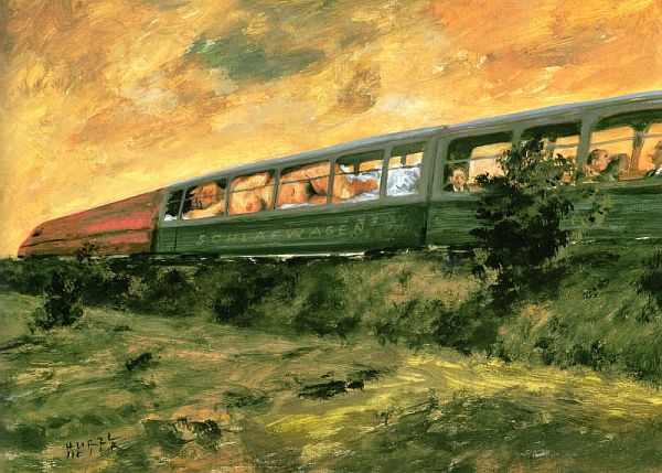 Hurzlmeiers Werk, in das er in einem eloquenten Vorwort höchstselbst einführt, weist ihn als einen Seelenverwandten in der Nachfolge des großen Robert Crumb aus, was Wunder, daß Hurzlmeiers „Thanksgiving“ deftig mit Crumbs Motiven spielt. Das Spiel mit Bekanntem findet sich (s.o.) auch in „Little Mermaid“ nach Francois Bouchers marzipansüßem „Ruhendem Mädchen“, während das saftige Gemälde „Lesereise“ (s.o.) die Adaption der Lady-Godiva-Legende von John Collier bis Kirsi Salonen und dem Bare Witch Project  aufgreift und „Sunset Boulevard“ eine tiefe Verneigung vor der Romantik Caspar David Friedrichs ist. Mit Arno Schmidt teilt er die Liebe zu Karl May und dem „edlen Wilden“ (Winnetou I und II). Der Beispiele weitere finden sich im Buch und im Gesamtwerk. Den Künstler selbst sehen wir nur selten im Selbstportrait („Selbst im Raumgleiter“ schmückt immerhin den Titel) - das hat er Rembrandt überlassen.